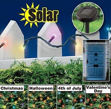 Solar-powered programmable lights accent fences, house edgings and shrubs and allow you to choose the color. Great for holidays or parties. No outlet needed,works anywhere in the yard. Flexible wire lets you twist, shape and adjust lightsaccording to the object. Seven color panel options include red, orange, yellow,blue, green, purple and white. Fifty lights are spaced 2 1/4" apart, total length 23 feet.