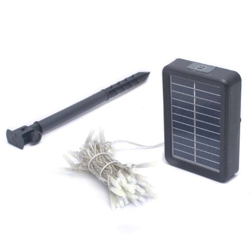 Automatically on and off (dusk-to-dawn, when fully charged) with built-in photo sensor! 50 Warm White LEDs Solar Stringlight Set (Clear Wire). Multi-Function switch allows you to choose between 4 different modes including Steady, flashing, chasing, fading. About 16 feet from first to last LED, plus 10.25 feet lead wire to solar panel. Adjustable knob allows the panel to swivel at the top of the stake in order to angle towards the sun. Meets IP 44 waterproof standard. 1.3Watt Solar Panel and 3 AA Rechargeable Ni-Mh 1300Mah Batteries. (Batteries are Included) With built-in automatic photocell control. Solar panel - 6" x 4.5" x 1.25"