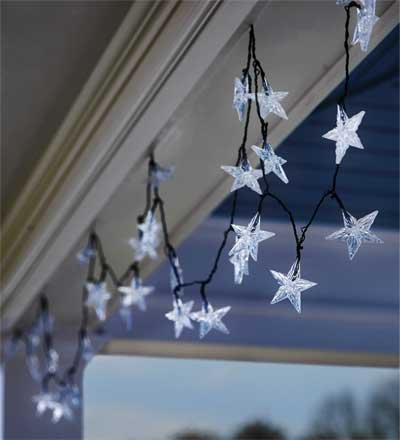 Solar Star String Lights . Light your deck, patio or railings with our Solar Star String Lights for an easy-to-add accent that's also energy efficient. The amorphous solar panel illuminates 50 star-shaped lights, each containing a bright white LED bulb. An 8-hour charge will power the lights for approximately 8-12 hours. Size 24'6" overall